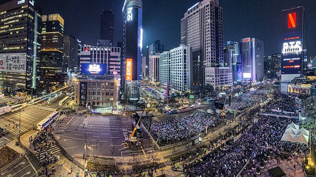 ‘BTS 컴백 라이브: 아리랑’이 도착한 21일 밤 서울 광화문광장 앞 세종대로. 무대 근처 좌석을 얻지 못한 관객들도 스탠딩석에서 스크린을 보며 공연을 즐기고 있다. 이날 눈에 띈 건 완충 지대처럼 곳곳에 배치한 빈 공간들이었다. 경찰 차벽으로 구획...